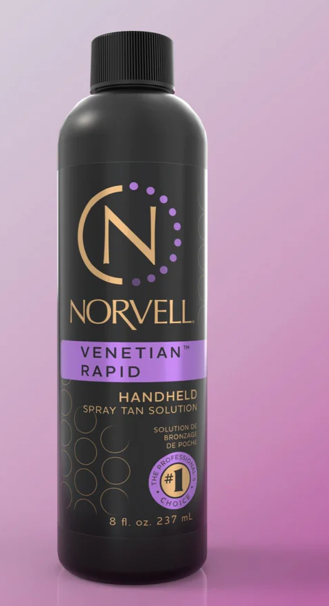 Norvell Venetian Rapid Solution is designed with cool violet-brown undertones to give a natural tan fast. Our Rapid formula gives your clients the ability to do a warm water rinse only; in 1 hour for light color, 2 hours for a medium tan or 3 hours for the darkest bronze.